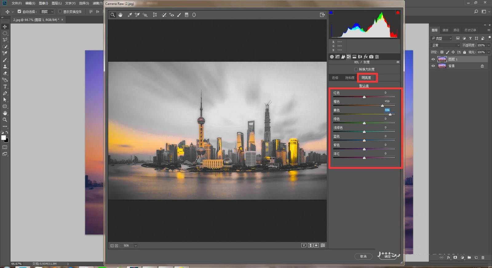 点击明度,调高黄色和橙色数值,点击确定,再点