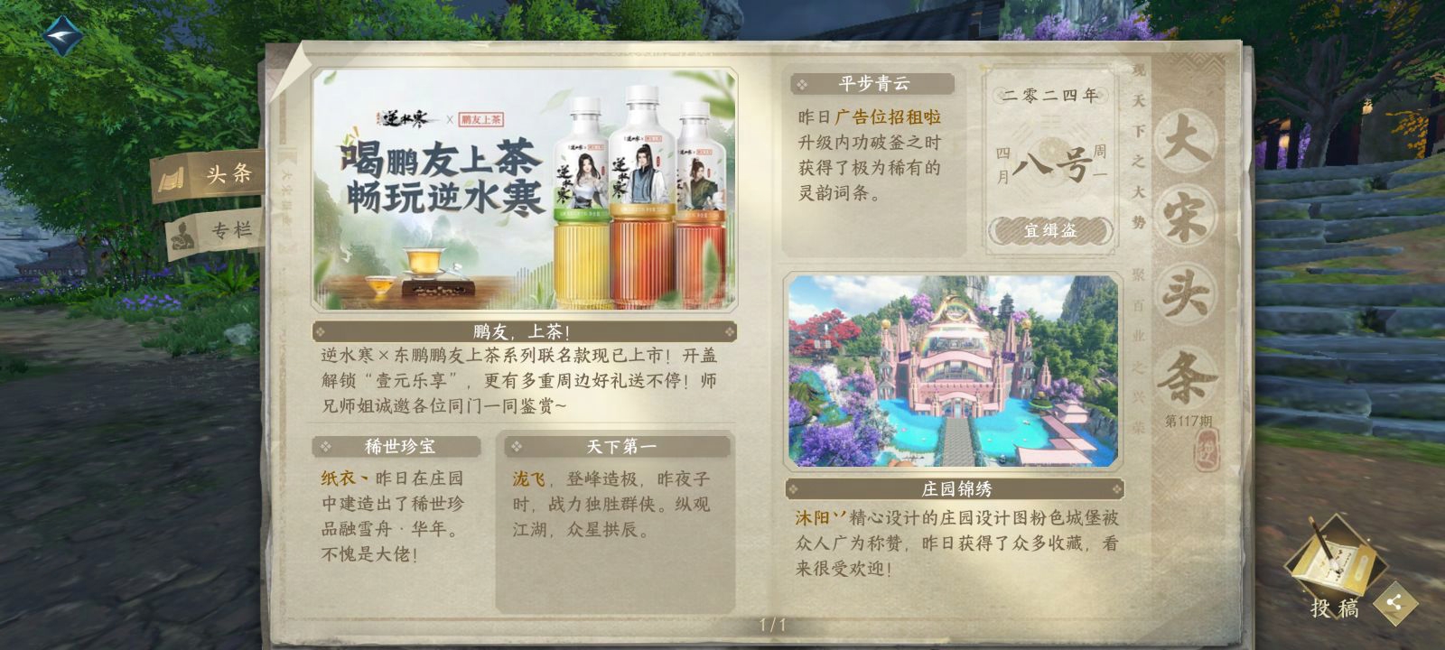 喝鹏友上茶,畅玩逆水寒!游戏内,喝茶的风潮也席卷了江湖,大宋头条、宣和周刊和江湖日志上,都能见到“鹏友上茶”的身影!