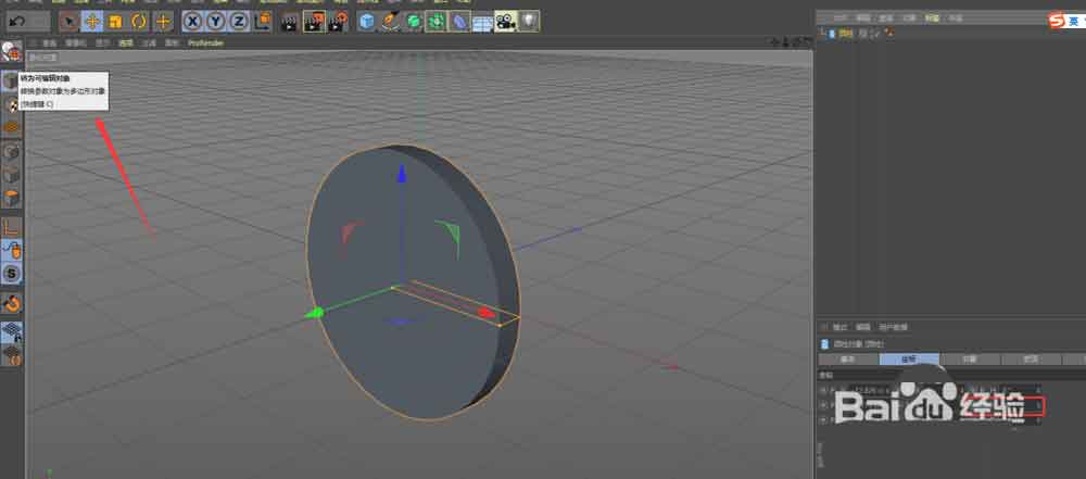 2、在场景中创建一个圆柱,调整大小和方向,然后按下C键转换为可编辑对象;