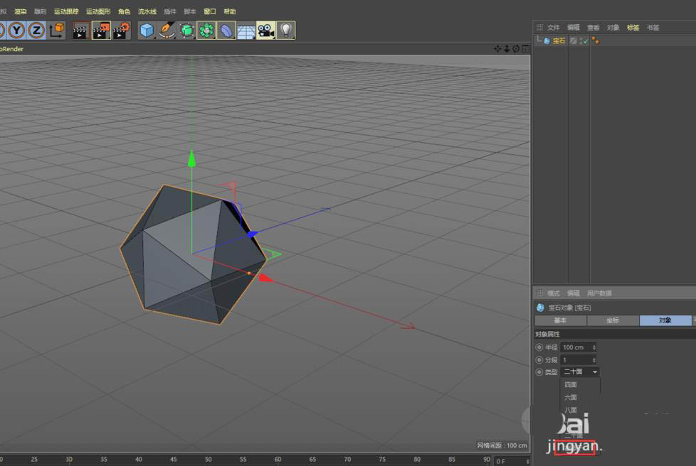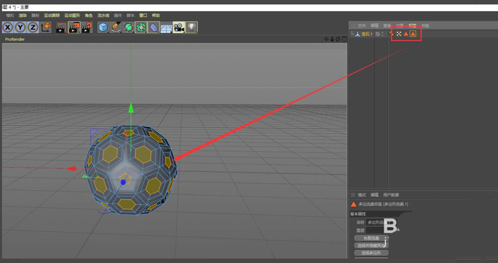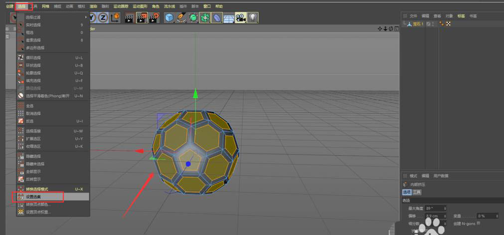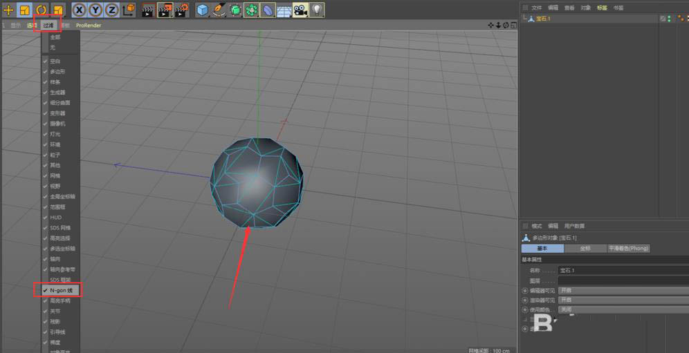 2、在场景中创建一个宝石 ,快捷键N-B光影着色把线框显示出来 , 把宝石的类型切换到碳原子,观察碳原子会发现它由几个六边形围着一个五边形组成,这样中间有一条线效果会不太好,按下C键把它C掉转换成可编辑对象 ,进入边层级,将多余的线里给选中按住Shift键可以多选,然后快捷M-N给消除掉;消除之后,碳原子表面会显示很多线条,这个是N-gon线,我们可以在过滤里面将N-gon线给去掉显示;