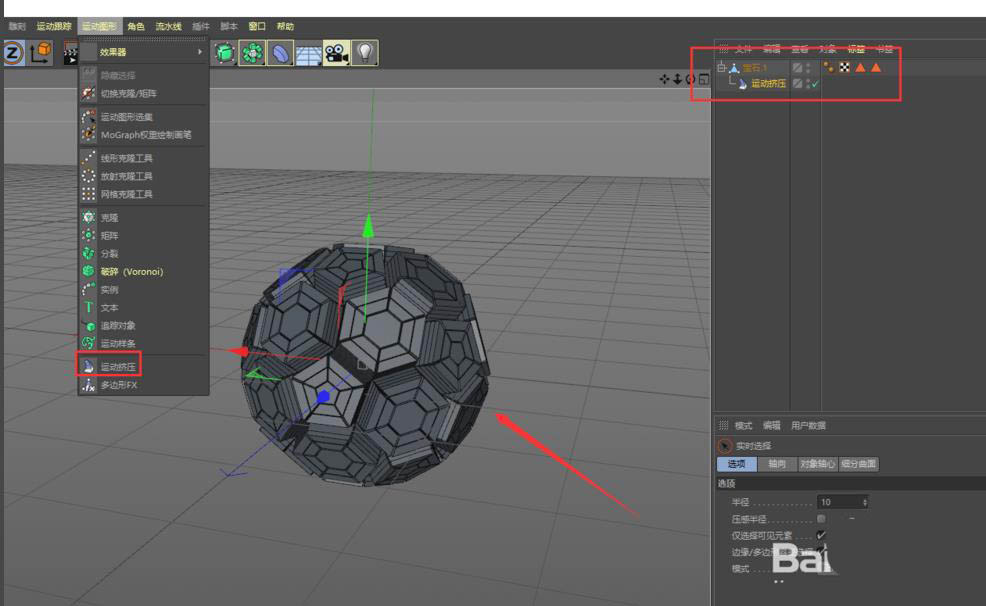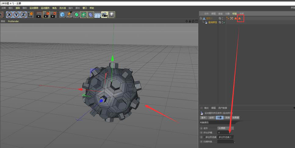 4、我们想要实现病毒生长出来得触角,所以要做一种生长,我们给碳原子添加运动挤压(运动图形-运动挤压),作为碳原子的子级出现,这个时候我们会发现整个碳原子都被挤压了,这个不是我们想要的,我们想要的是在我们指定的选集里面进行挤压,所以我们将运动挤压得多边形选集选择为我们想要得选集,这样它就长生了我们想要得触角部分,我们可以调节步幅或者通过调节变换里面得Z轴来调整触角得长度,这个根据自己实际需求去调整相应得触角长度;