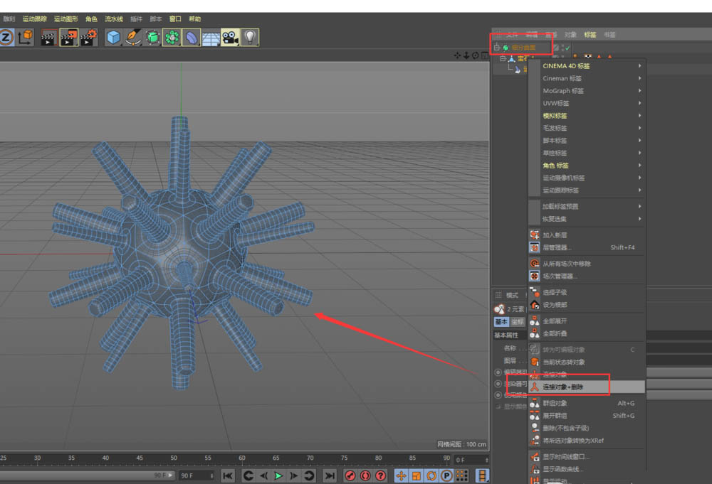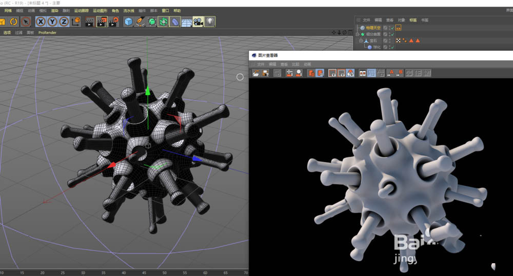 5、给宝石添加一个细分曲面,我们可以选中碳原子和运动挤压右击选择链接对象+删除,这样病毒就成了一个整体;