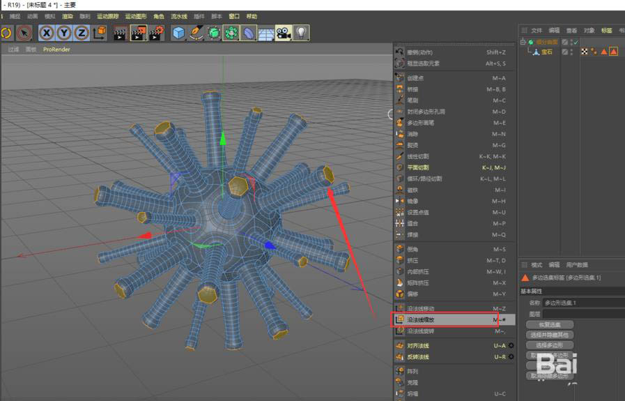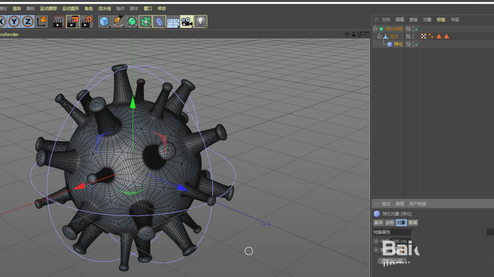 6、然后在选集下,我们右击选择沿法线进行缩放,将面进行放大之后快捷键D键调用出挤压,挤压一定程度之后,病毒得的触角就会产生一个大头式得触角,如果我们在选集的情况下还想扩大选取,我们可以找到选择里面的扩展选区,将选取进行扩展;观察触角可以发现它的触角面会比较平,我们给碳原子添加一个球化的变形器,作为碳原子的子级,可以观察到病毒鼓起来了,我们可以通过调节球化的半径和强度来调整成你想要的样子;