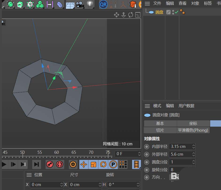创建一个圆盘:内部半径为3.15,外部半径为5.6,圆盘分段为1,旋转分段为8.