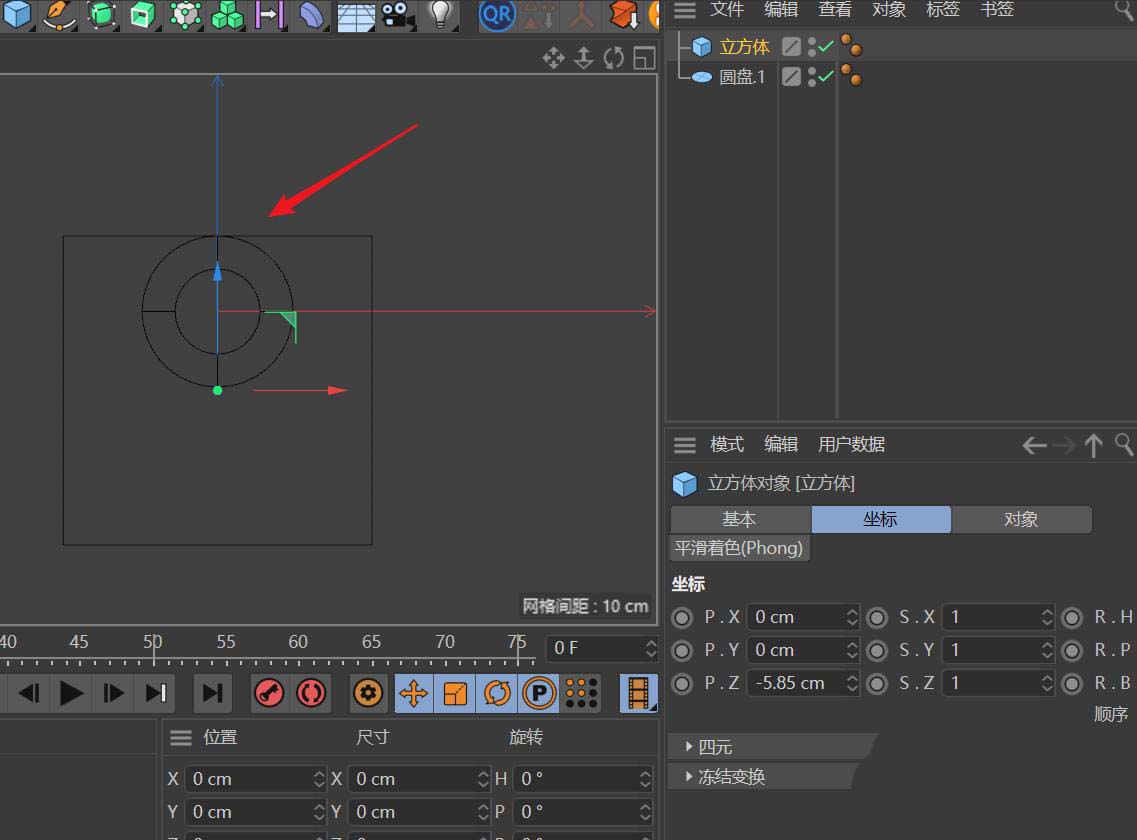 创建一个22.9*22.9的正方形(立方体也行)用来作为端子的长度参考。将正方形的上边与圆盘的上圆弧点重合;如图所示。