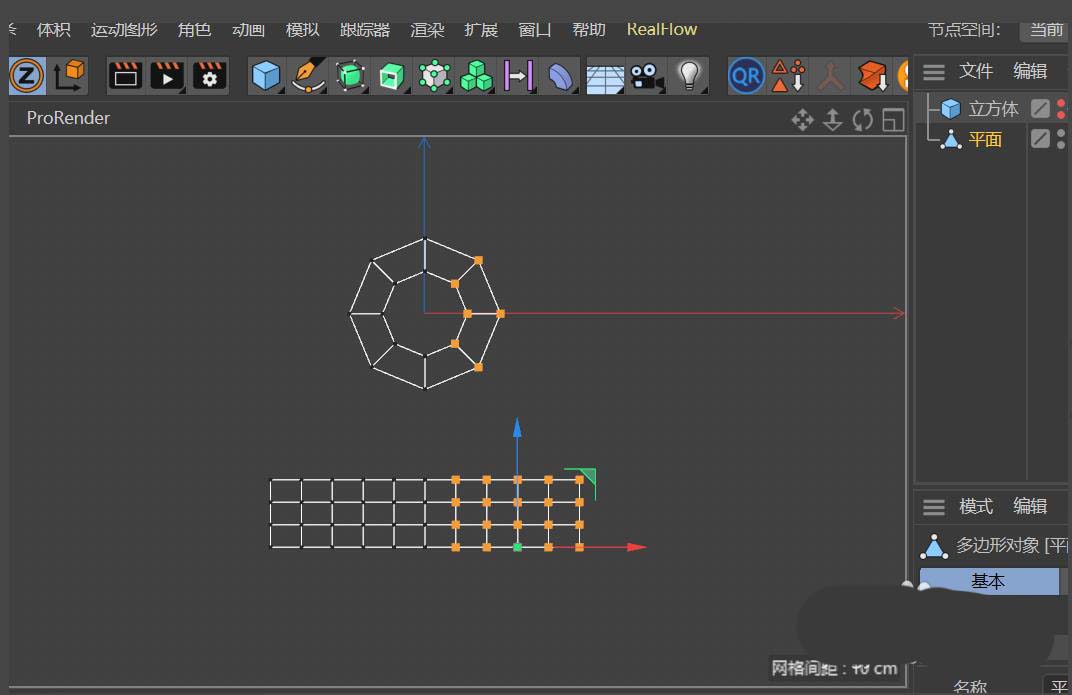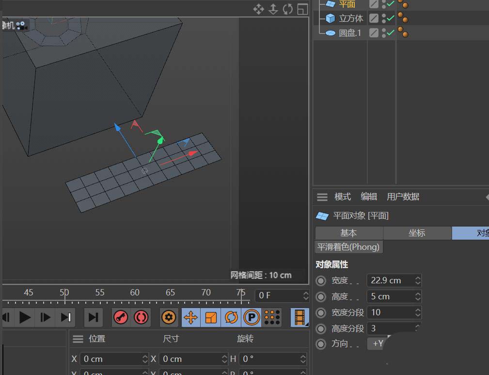 创建一个宽度为22.9,高度为5的平面,其宽度分段为10,高度分段为3。将 平面转为可编辑对象调整位置,使平面的底边与上步的正方形底边重合。如图所示。