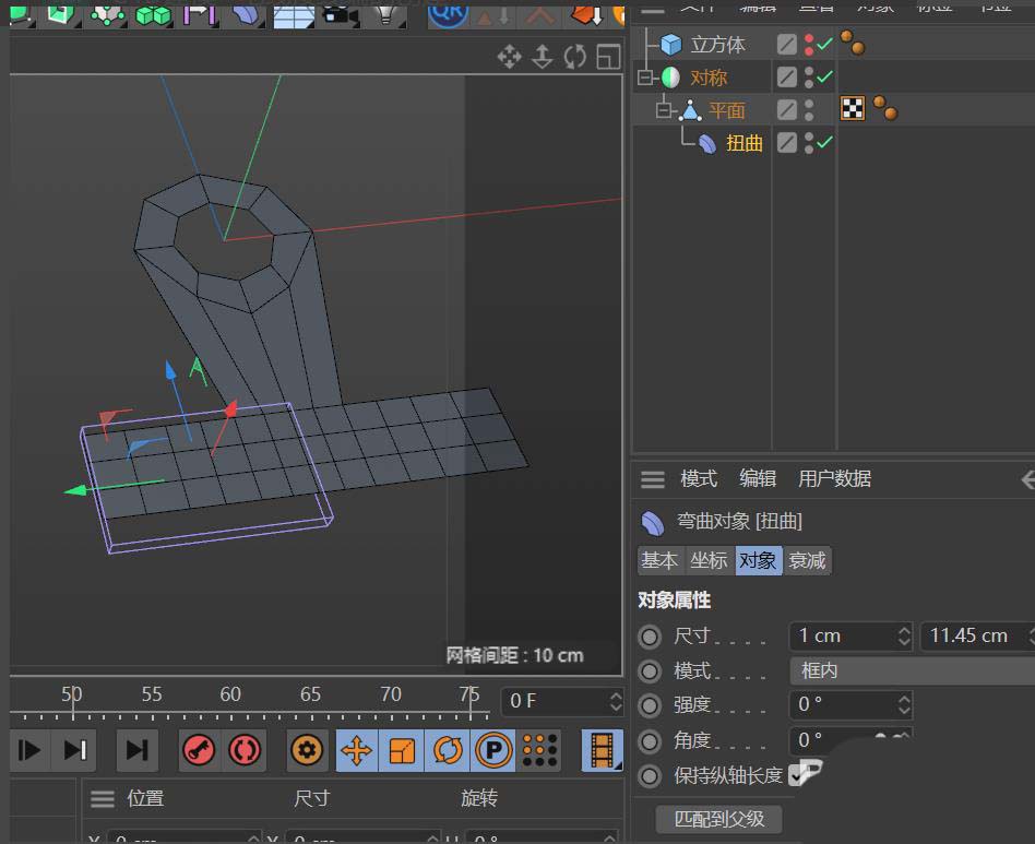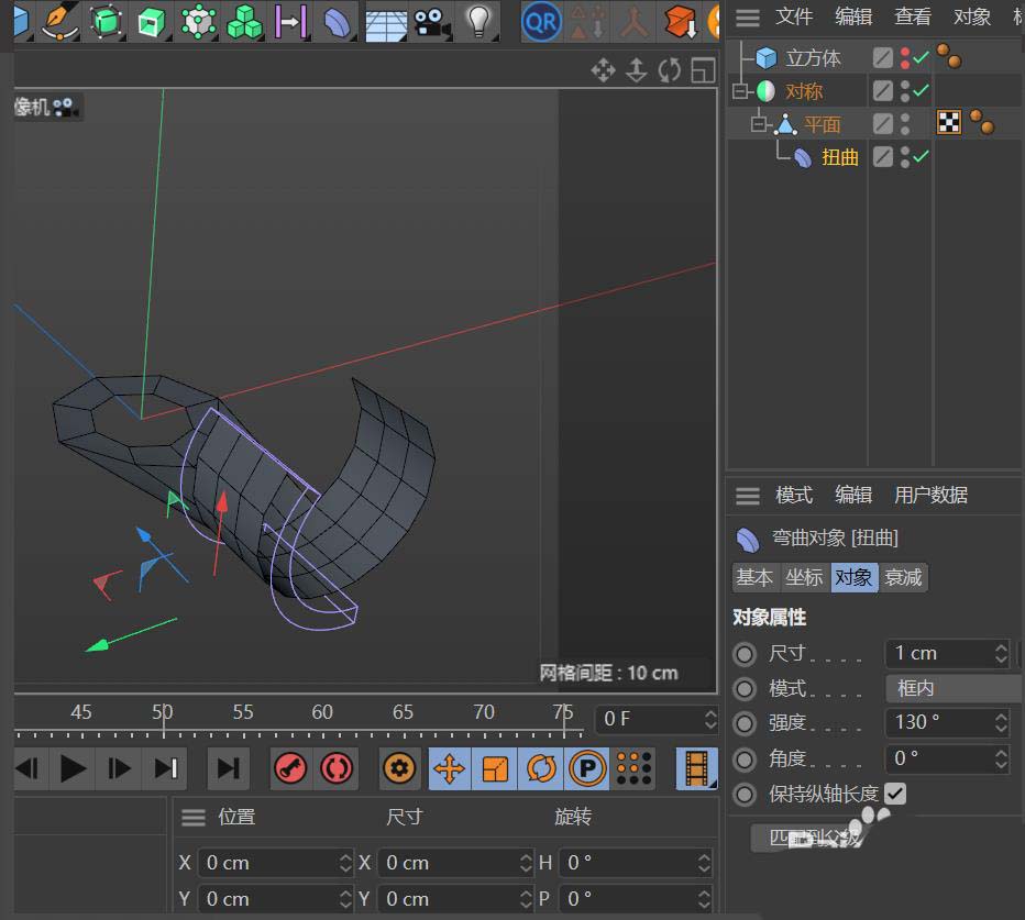 给对象添加一个扭曲变形器,将变形器调整匹配到平面的区域,选择为框内模式,强度调整为130度;将当前状态转为对象。
