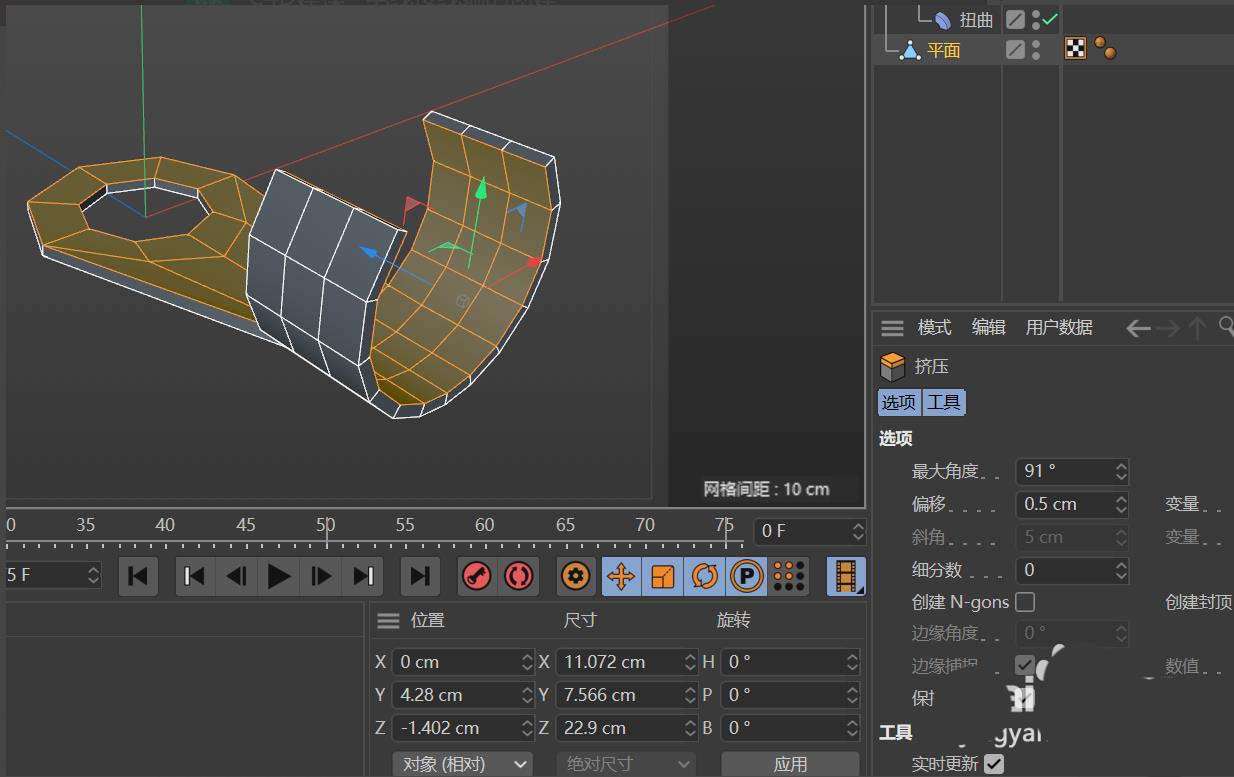 选中对象所有面进行挤压,挤压值为0.5,勾选创建封顶。如图所示。