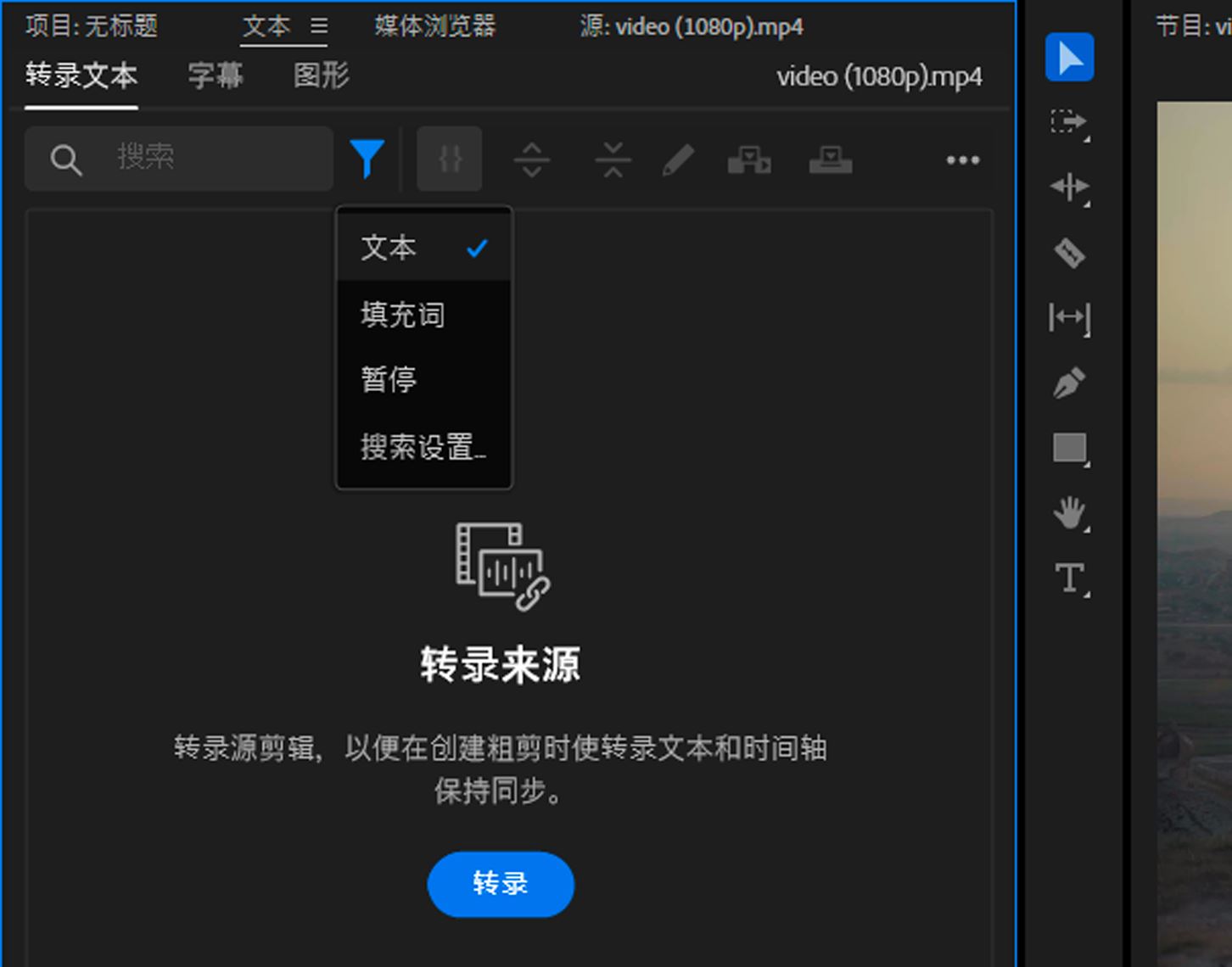 注意:您可以通过单击文本面板右上角的三个点,然后选择转录文本视图选项,来调整 Premiere Pro 可以检测到的最短停顿长度。