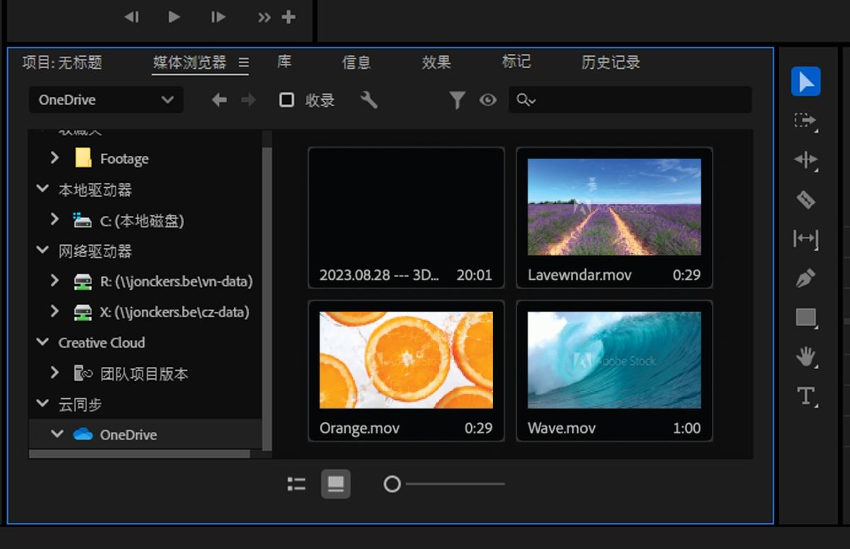 关联的 One Drive 存储位置中的文件在更新时都会同步,并会开始反映在 Premiere Pro 媒体浏览器中。