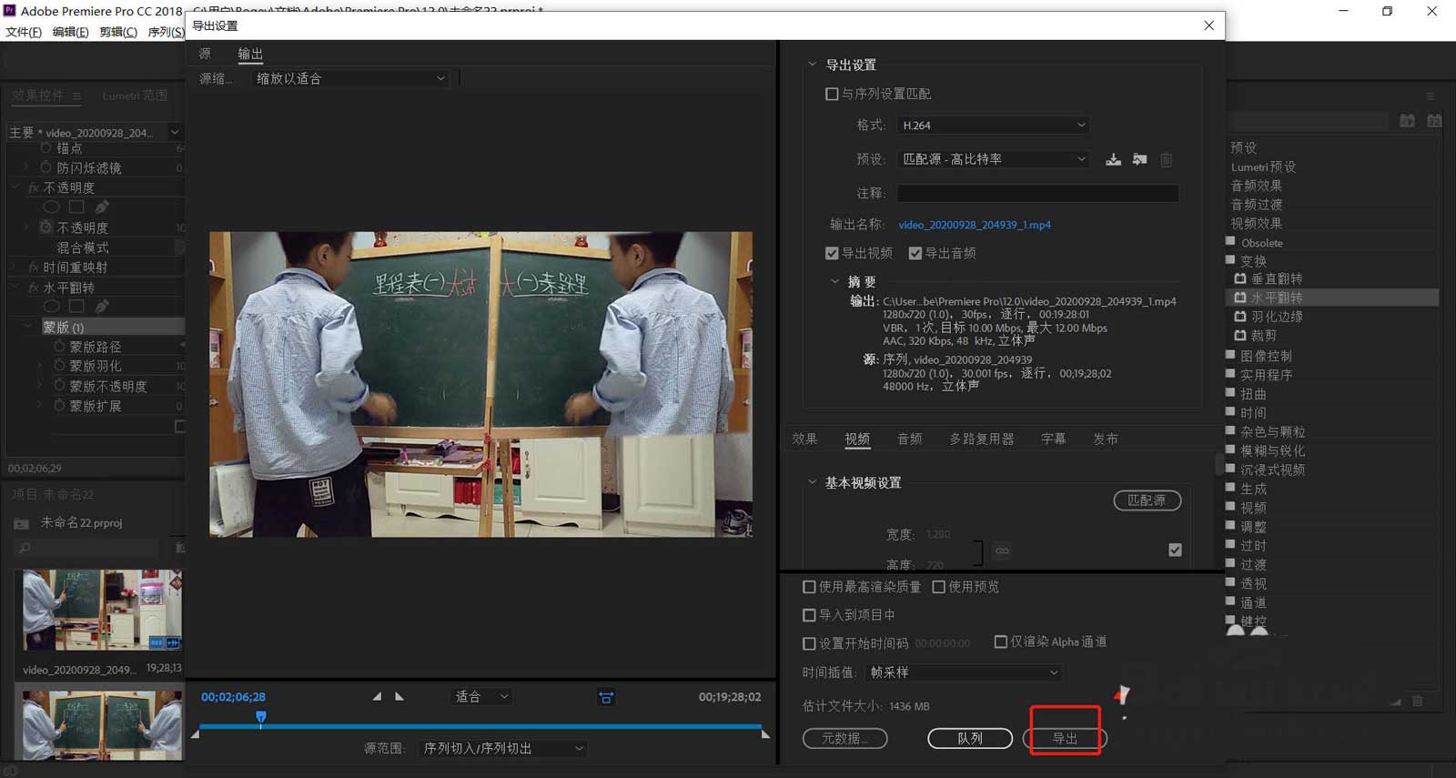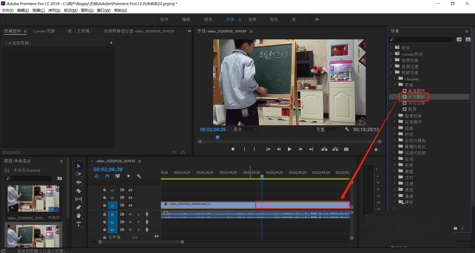 4、点击右侧效果窗口中的“视频效果”--“变换”--“水平翻转”,将该效果拖动到时间轴视频轨道上。
