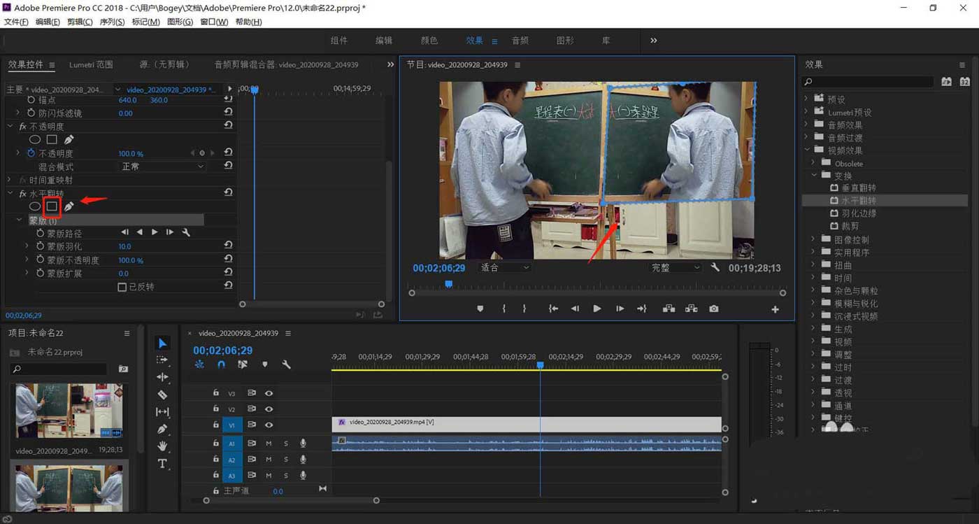 5、点击左上方的效果控件窗口,点击水平翻转效果创建蒙版,设置翻转区域。