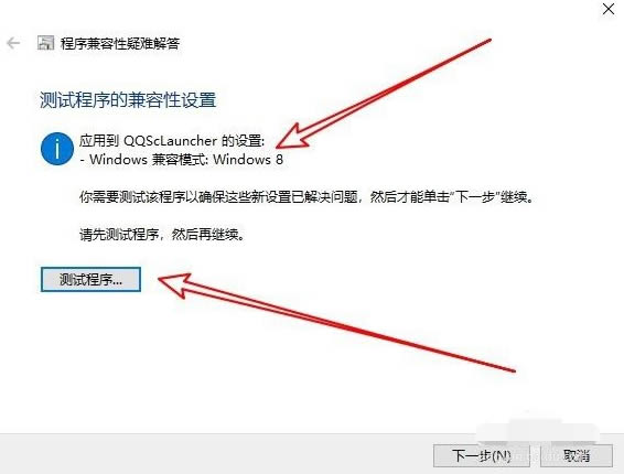 5、然后在打开的测试程序的兼容设置窗口,会自动的为应用设置兼容设置,我们点击“测试程序”看一下应用是否可以正常运行就可以了。