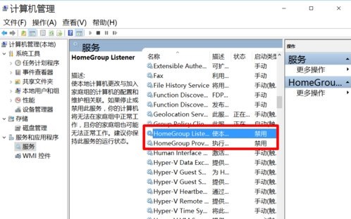 2、在左侧的菜单选择“服务”,并在右侧找到“HomeGroup Listener”和“HomeGroup Provider”两个服务。