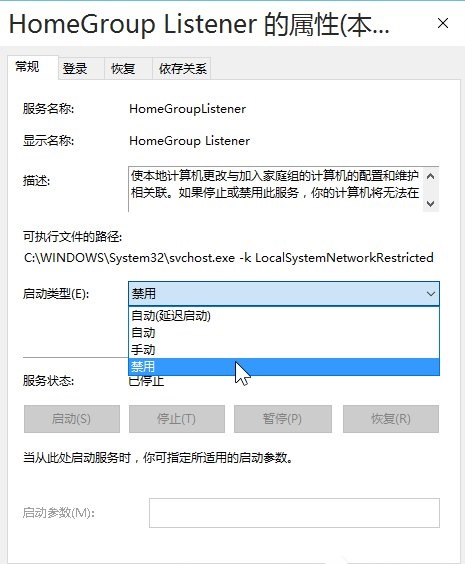 4、这样,就关闭了“家庭组”功能。win8时代就有的家庭组功能会不断读写硬盘,造成硬盘占用高,这个问题在win10中依然存在。关闭这个功能会使硬盘占用大幅降低,不再出现动不动就占用100%的情况。(可在任务管理器中查看)