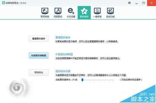 2、对于缩略图显示不正常的问题,还可以通过软媒魔方中的电脑医生组件来修复,如下图所示,点击“图标缓存”中的“恢复图标缩略图”即可。
