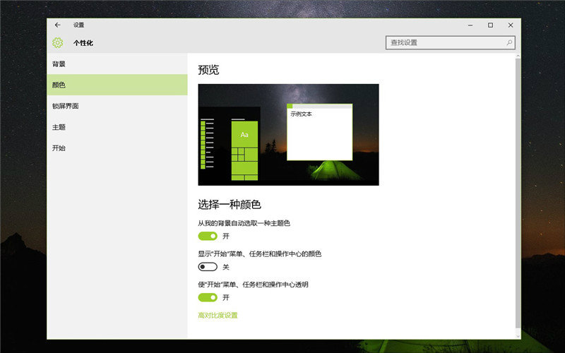背景下方有一个“颜色”面板,可以自行定义开始菜单及系统主题颜色。注意!这里有一个选项,可以控制开始菜单、任务栏和操作中心是否透明。换言之,这是整个Win10系统的一键透明度开关,如果感觉自己的硬件吃不消运行不畅,可试着先将它关闭