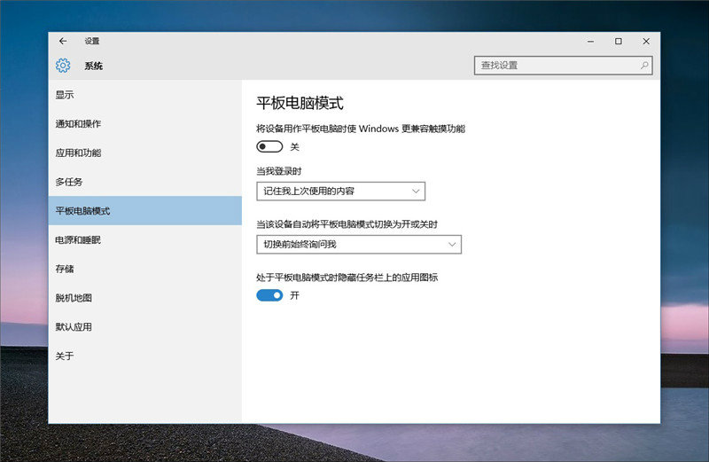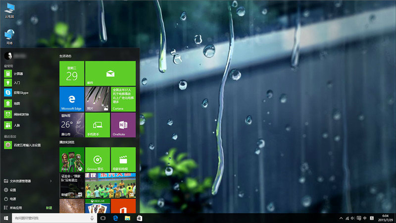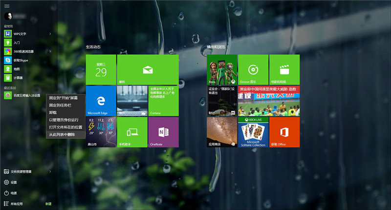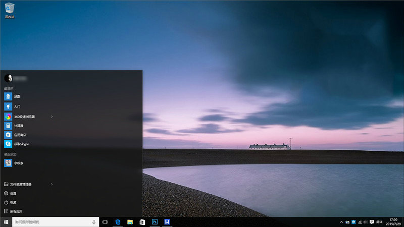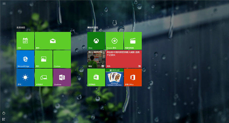 这是平板模式下的开始菜单,可以看到,已经和Win8非常相似了。而且磁贴的尺寸也在加大,使其更适合触摸使用。需要注意的是,平板模式下开始菜单是不会自动模糊壁纸的,我这张效果不明显是因为壁纸本身就是模糊的。