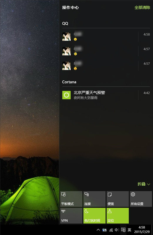 通知面板是Win10里的新玩意儿,可以自动收集起所有未得到用户响应的通知(包括系统和APP),也就是说Win8里那些一闪而过的通知终于有了一个地方可以让你优雅地回看。此外通知面板下方还集成了快速行动按钮,方便用户快速启闭一些功能或启动对应设置,具体数量取决于用户硬件环境,平板电脑可能会多一些