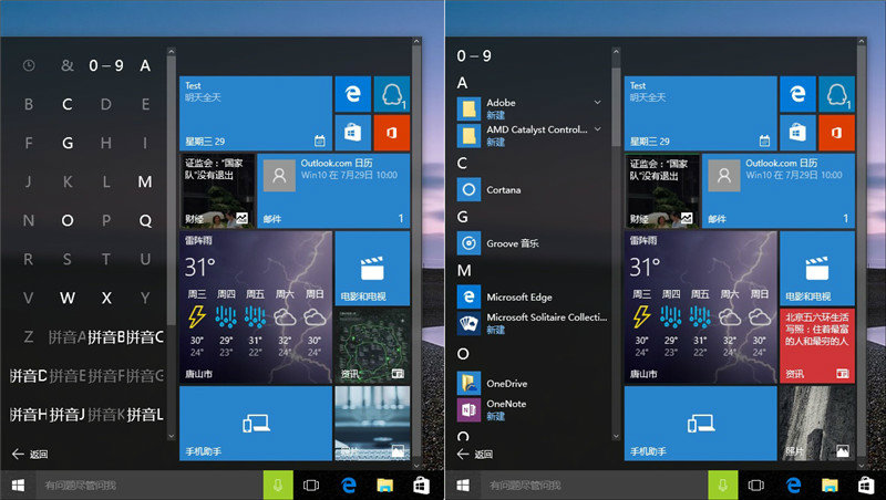 Win10应用程序列表默认采用字母检索,条理性还是不错的,而且你还可以点击字母打开索引页进行快速选择