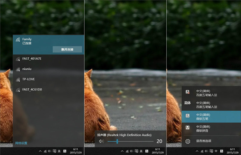 除了开始菜单和通知中心外,还有一些桌面元素也加入了Aero特效,比方说音量滑杆、语言栏、网络面板等
