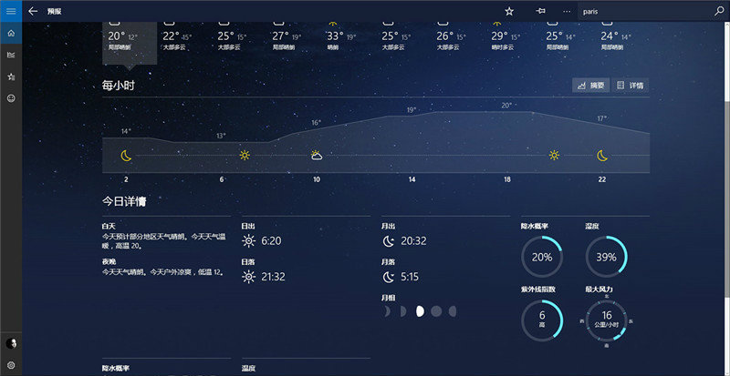 如果是国外城市,还能收到更多天气内容(如能见度、气压值、逐小时图表、降水概率、日出日落时间、紫外线、月相等),主要还是数据源的缘故(图为法国巴黎)