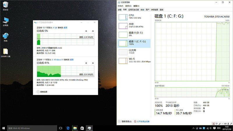 文件复制器沿袭了Win8版设计,支持多源传输、复制中暂停、中途中止、速率曲线图等功能