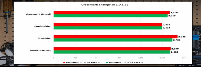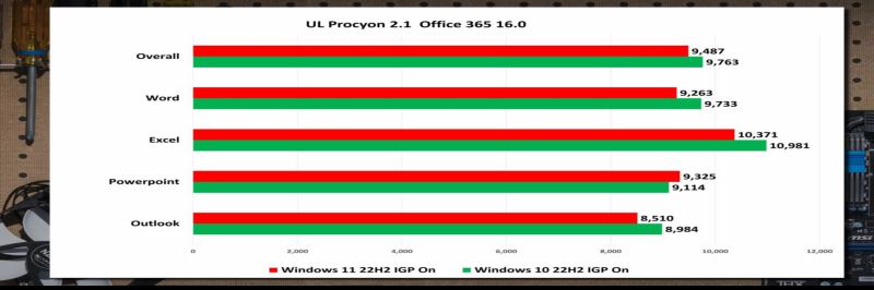 此外,还有 Chrome 107 测试,Procyon 的 Office 基准测试结果,以及 Bapco 的 Crossmark 企业测试。Office 365 中,Win10 在 Word、Excel、Outlook 中都比 Win11 快,综合下来更胜一筹。