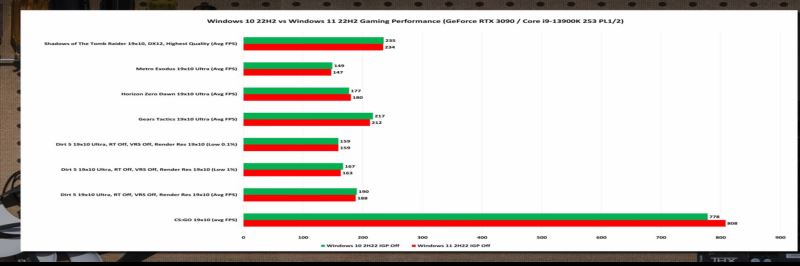最后是游戏测试,结果显示除了《反恐精英:全球攻势》之外,两个操作系统的性能几乎相同,众所周知这是一个只能在单线程模式下运行的游戏。