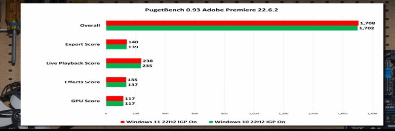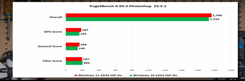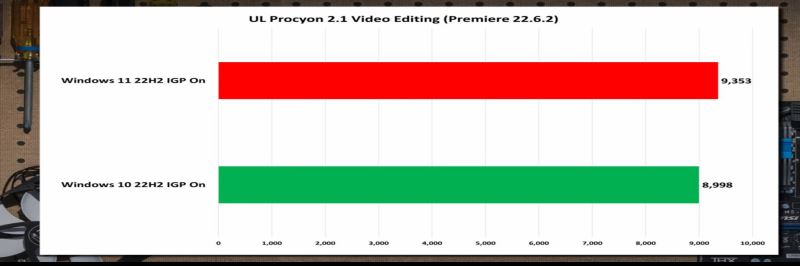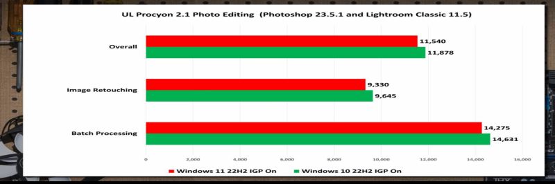 测试结果显示,Windows 11 当然有表现更好的情况,但也有很多情况并非如此,Windows 10 也在相当多的情况下取得了领先。以下是在 PugetBench 和 UL 的 Procyon 中进行照片和视频编辑获得的基准数据。在 UL Procyon 中 Adobe Photoshop、Lightroom Classic 中,Win10 得分更高。