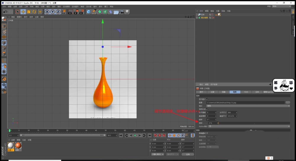2、把找到的图片拖入C4D的正视图中,然后可以调节透明度觉得太亮的话,快捷键是shift+v找到背景那里就可以调节,如图。