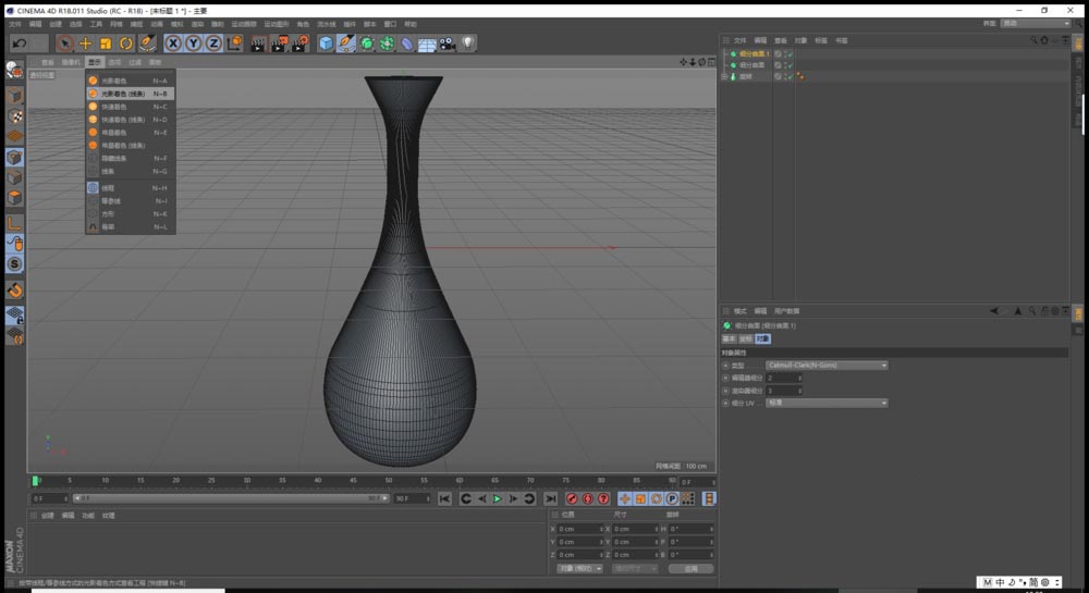5、我们再加入一个细分曲面,然后把刚才那个旋转的层放到细分曲面的子层中,我们可以打开光影着色(线条)来观看更明显。如图