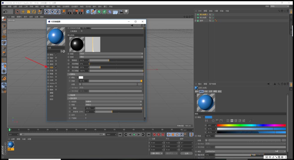 7、选择完颜色然后再调整我们的反射,瓶子一般都是陶瓷的有一定的反光,如图更具需求调整。最后把材质拉到我们的瓶子就简单的制作完成了。