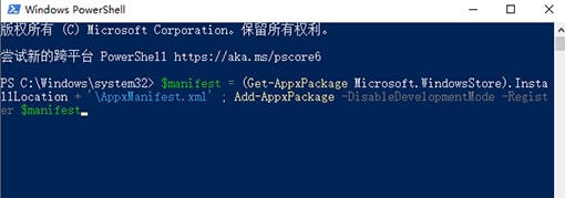 $manifest = (Get-AppxPackage Microsoft.WindowsStore).InstallLocation + 'AppxManifest.xml' ; Add-AppxPackage -DisableDevelopmentMode -Register $manifest