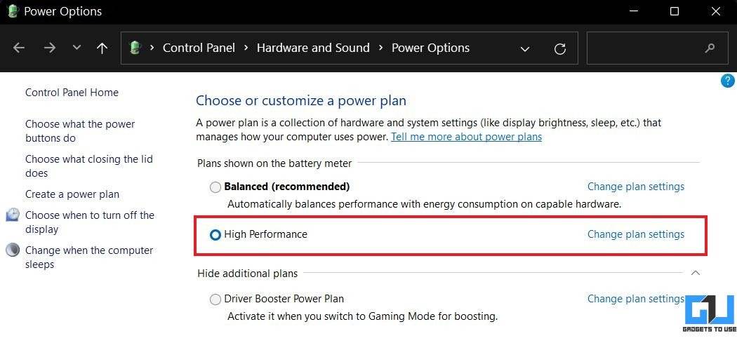 3.在下一个屏幕上,查找高性能计划并选择它。您还可以选择Driver Booster Power Plan进行游戏。