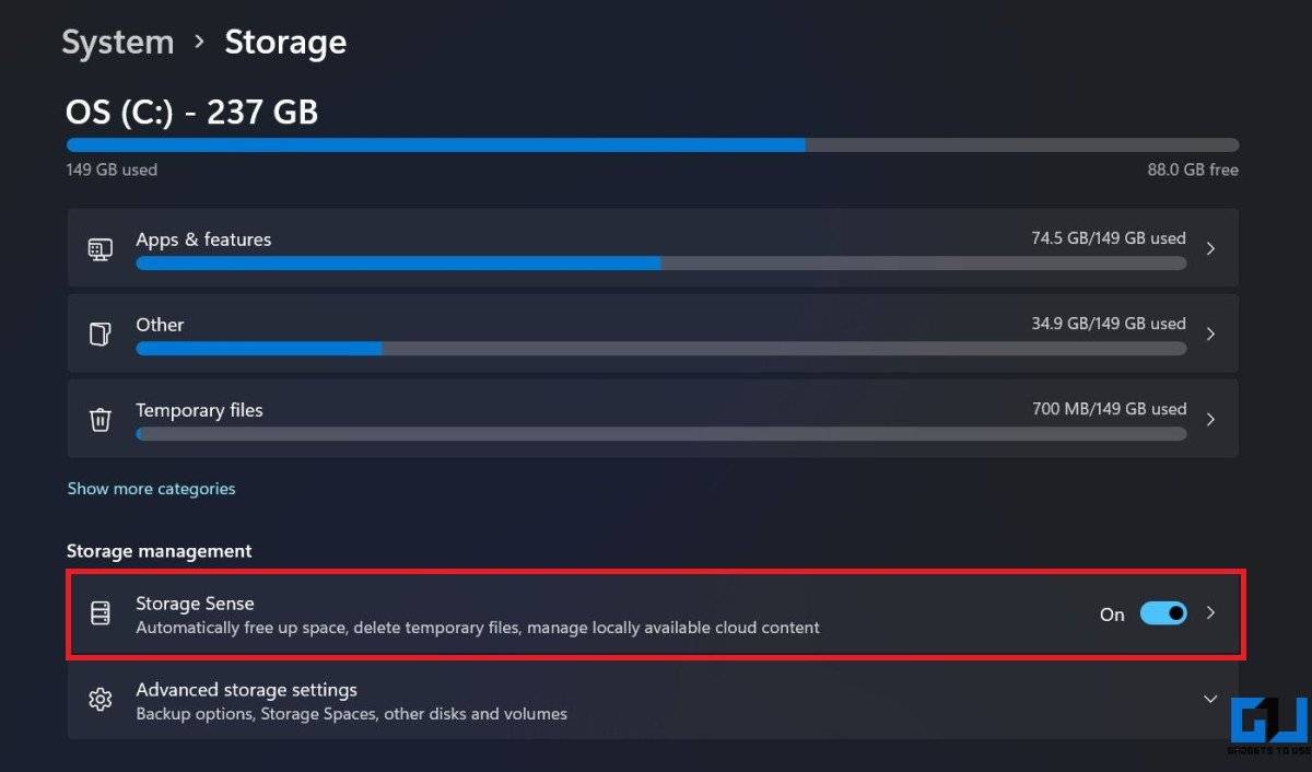 Windows 11 继承了 Windows 10 的存储感知功能。它旨在监控计算机的存储并在需要时通过删除不需要的文件(例如临时系统文件、回收站中的项目等)自动释放空间。