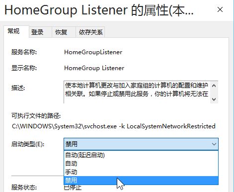 这样,就关闭了“家庭组”功能。win8时代就有的家庭组功能会不断读写硬盘,造成硬盘占用高,这个问题在win10中依然存在。