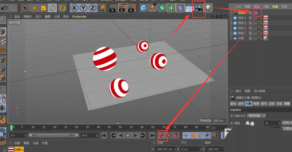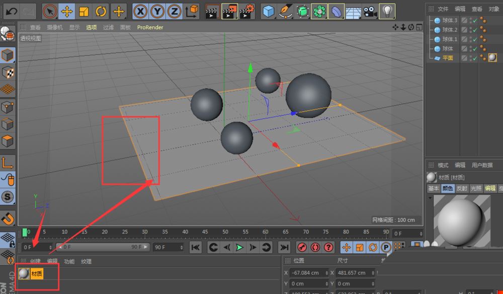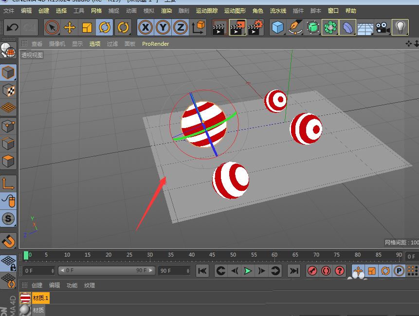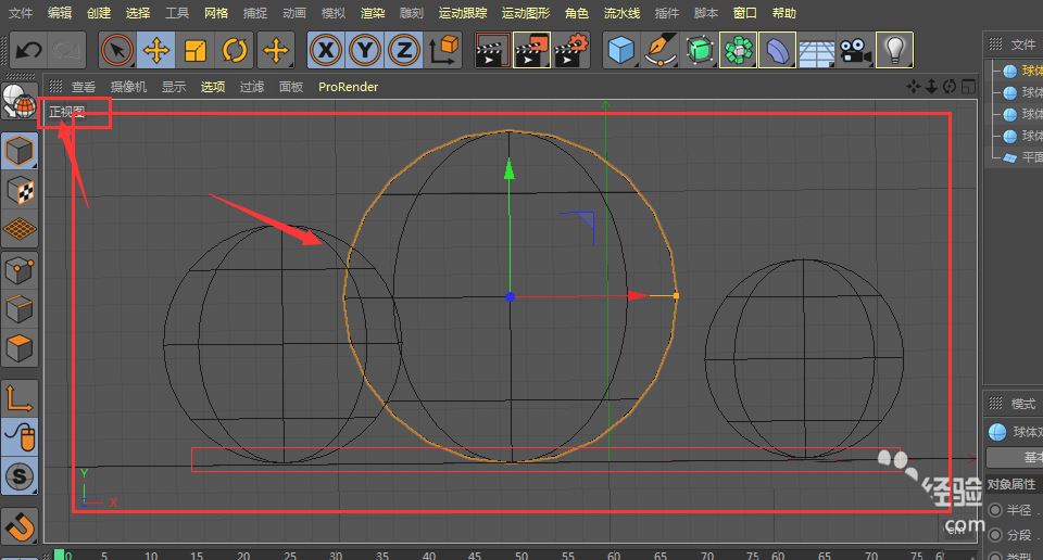 点击中间选择正视图中,调整几个球体和底面的位置,调整到一个水平面位置,如图所示