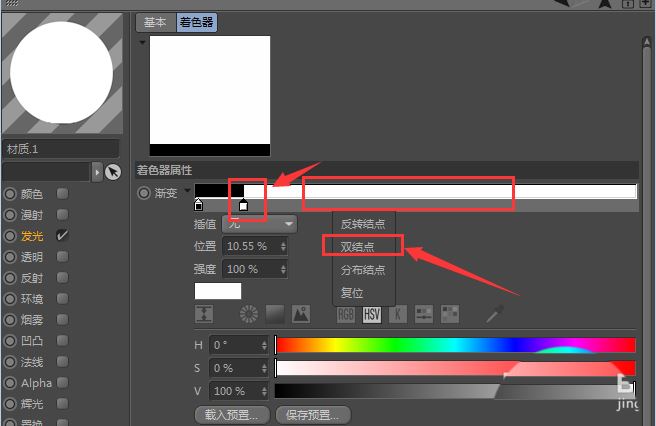 将右侧的渐变条做东到靠左侧位置,然后在渐变条下方右键选择里面的双节点选项