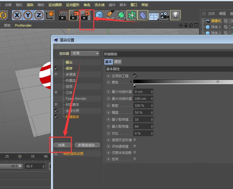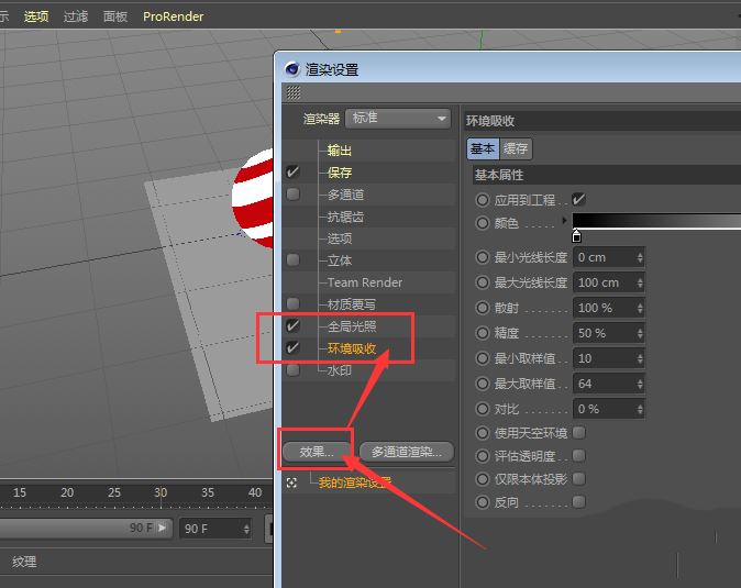 在效果菜单栏中添加环境吸收和全局光照两个效果属性