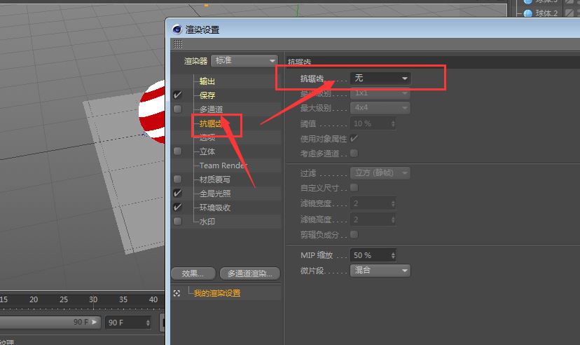 再打开上方的抗锯齿属性,将里面的属性设置为无,如图所示