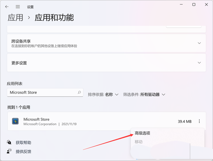 首先,打开设置(Win+i),定位到当前路径,应用 > 应用和功能,搜索找到Microsoft Store,然后,点击该项目后面的菜单按钮,选择高级选项