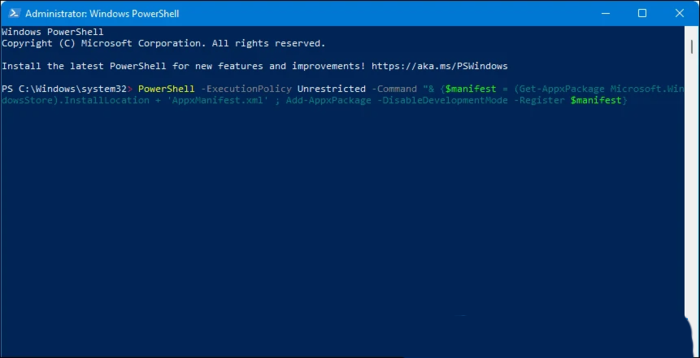 PowerShell -ExecutionPolicy Unrestricted -Command "& {$manifest = (Get-AppxPackage Microsoft.WindowsStore).InstallLocation + 'AppxManifest.xml' ; Add-AppxPackage -DisableDevelopmentMode -Register $manifest}