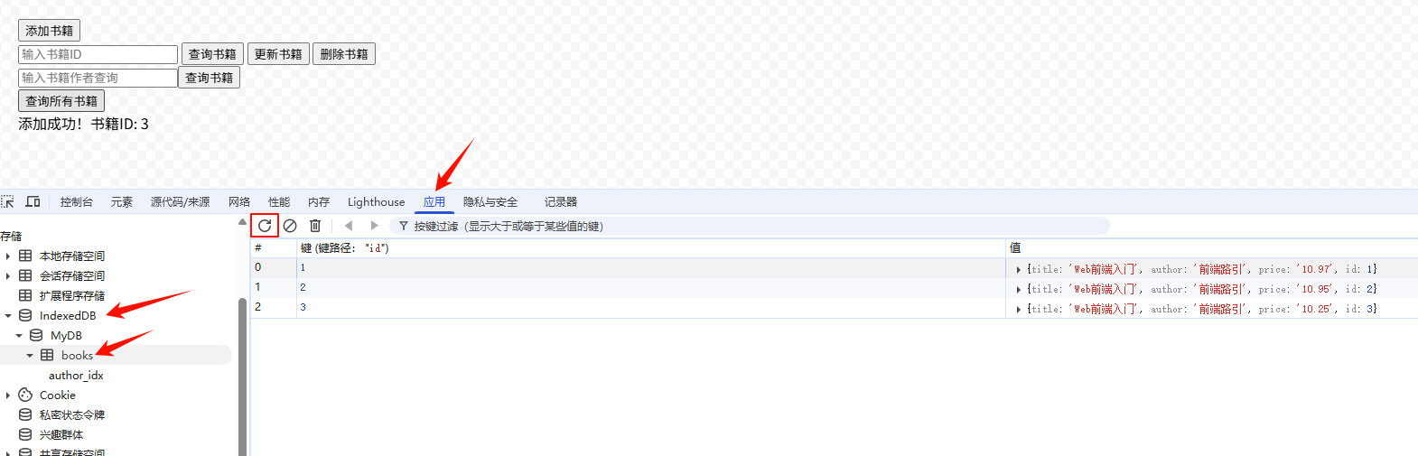 <div> <button id="js_add_btn">添加书籍</button></div><div> <input type="text" name="" id="js_book_id" placeholder="输入书籍ID"/> <button id="js_get_by_id_btn">查询书籍</button> <button id="js_update_by_id_btn">更新书籍</button> <button id="js_delete_by_id_btn">删除书籍</button></div><div> <input type="text" name="" id="js_book_author" placeholder="输入书籍作者查询"/><button id="js_get_by_author_btn">查询书籍</button></div><div> <button id="js_get_all_btn">查询所有书籍</button></div><div id="output"></div><script> (() => { // 数据库配置 const dbName = 'MyDB'; const storeName = 'books'; const output = document.getElementById('output') let db = null; function setOutputContent(html) { output.innerText = html; } // 初始化数据库 const initDB = () => { const request = indexedDB.open(dbName); // 数据库升级/创建时触发 request.onupgradeneeded = (event) => { db = event.target.result; // 创建对象存储空间(类似数据库表) const store = db.createObjectStore(storeName, { keyPath: 'id', // 主键 autoIncrement: true, // 自动生成ID }); // 创建索引(允许通过作者查询) store.createIndex('author_idx', 'author', { unique: false }); console.log('数据库已创建/升级'); }; // 数据库打开成功 request.onsuccess = (event) => { db = event.target.result; console.log('数据库已打开'); }; // 数据库打开失败 request.onerror = (event) => { console.error('数据库错误:', event.target.error); setOutputContent('数据库错误'); }; }; // 封装包装函数,用于执行数据库相关方法 function wrapper(func) { return new Promise((resolve, reject) => { const transaction = db.transaction([storeName], 'readwrite'); const store = transaction.objectStore(storeName); const res = func(store) res.onsuccess = () => { resolve(res.result) }; res.onerror = (event) => { reject(event.target.error) }; }); } // 添加数据 const addBook = async (book) => { try { const result = await wrapper((store) => store.add(book)) console.log(result); setOutputContent(`添加成功!书籍ID: ${result}`); } catch (error) { console.error(error); setOutputContent('添加失败'); } }; // 通过ID查询数据 const getBook = async (id) => { try { const book = await wrapper((store) => store.get(id)) if (book) { console.log('查询结果:', book); setOutputContent(`书名: ${book.title}n作者: ${book.author}n价格: $${book.price}`); } else { console.log('未找到书籍'); setOutputContent('未找到该书籍'); } } catch (error) { console.error(error); setOutputContent('查询失败'); } }; // 查询全部数据 const getAllBook = async () => { try { const book = await wrapper((store) => store.getAll()) if (book) { console.log('查询结果:', book); setOutputContent(`总数:${book.length}`); } else { console.log('未找到书籍'); setOutputContent('未找到该书籍'); } } catch (error) { console.error(error); setOutputContent('查询失败'); } }; // 更新数据--数据不存在时会添加数据 const updateBook = async (book) => { try { const result = await wrapper((store) => store.put(book)) console.log(result); setOutputContent(`更新成功!结果: ${result}`); } catch (error) { console.error(error); setOutputContent('更新失败'); } }; // 删除数据 const deleteBook = async (id) => { try { const result = await wrapper((store) => store.delete(id)) console.log(result); setOutputContent(`删除成功!结果: ${result}`); } catch (error) { console.error(error); setOutputContent('删除失败'); } }; // 根据作者查询 const getByAuthor = async (author) => { try { const result = await wrapper((store) => { const index = store.index("author_idx"); const request = index.getAll(author); return request; }) console.log(result); setOutputContent(`查询成功!结果: ${JSON.stringify(result)}`); } catch (error) { console.error(error); setOutputContent('查询失败'); } }; // 添加书籍 document.getElementById('js_add_btn').onclick = () => { addBook({ title: 'Web前端入门', author: '前端路引', price: (0.99 * Math.random() + 10) .toFixed(2), }); }; // 根据ID查询 document.getElementById('js_get_by_id_btn').onclick = () => { const bookId = document.getElementById('js_book_id').value; getBook(Number(bookId)); }; // 根据ID删除 document.getElementById('js_delete_by_id_btn').onclick = () => { const bookId = document.getElementById('js_book_id').value; deleteBook(Number(bookId)); }; // 根据ID更新 document.getElementById('js_update_by_id_btn').onclick = () => { const bookId = document.getElementById('js_book_id').value; updateBook({ // 主键ID id: Number(bookId), title: 'Web前端入门', author: '公众号:前端路引', price: (0.99 * Math.random() + 10) .toFixed(2), }); }; // 根据作者查询 document.getElementById('js_get_by_author_btn').onclick = () => { const author = document.getElementById('js_book_author').value getByAuthor(author); }; // 查询全部 document.getElementById('js_get_all_btn').onclick = () => { getAllBook(); }; // 页面加载时初始化数据库 initDB(); })();</script>