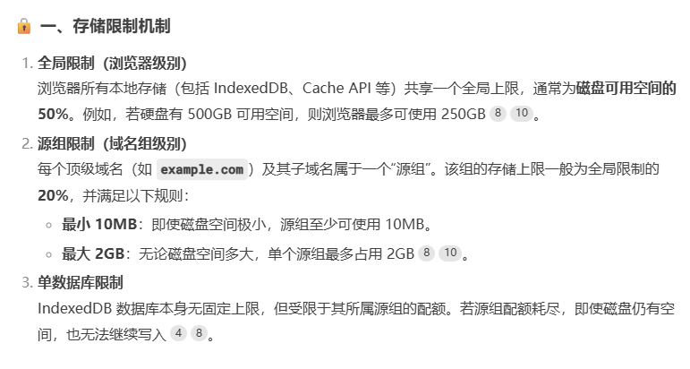 navigator.storage.estimate().then((estimate) => { console.log( `已使用:`, ( (estimate.usage / estimate.quota) * 100 ).toFixed(2) ); console.log(`可使用:`, (estimate.quota / 1024 / 1024).toFixed(2) + "MB");});
