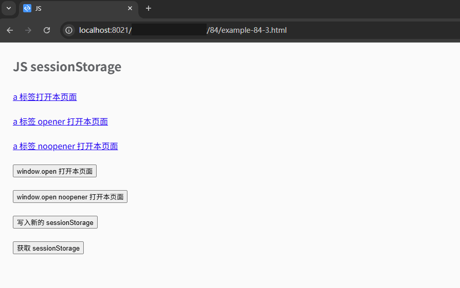<a href="./example-84-3.html" target="_blank">a 标签打开本页面</a><br><br><a href="./example-84-3.html" target="_blank" rel="opener">a 标签 opener 打开本页面</a><br><br><a href="./example-84-3.html" target="_blank" rel="noopener">a 标签 noopener 打开本页面</a><br><br><button onclick="window.open('./example-84-3.html')">window.open 打开本页面</button><br><br><button onclick="window.open('./example-84-3.html', '_blank', 'noopener')">window.open noopener 打开本页面</button><br><br><button id="set">写入新的 sessionStorage</button><br><br><button id="get">获取 sessionStorage</button><br><br><div id="output"></div><script> (() => { const output = document.querySelector('#output'); document.querySelector('#set').addEventListener('click', e => { sessionStorage.setItem('now', Date.now()); }) document.querySelector('#get').addEventListener('click', e => { const now = sessionStorage.getItem('now'); output.innerText = now ?? '无'; }) })()</script>