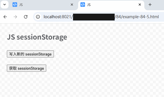 <button id="set">写入新的 sessionStorage</button><br><br><button id="get">获取 sessionStorage</button><br><br><div id="output"></div><script> (() => { const output = document.querySelector('#output'); document.querySelector('#set').addEventListener('click', e => { sessionStorage.setItem('now', Date.now()); }) document.querySelector('#get').addEventListener('click', e => { const now = sessionStorage.getItem('now'); output.innerText = now ?? '无'; }) })()</script>