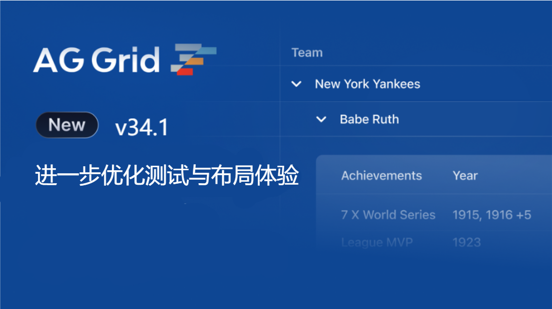 近日,JavaScript 数据表格方案AG Grid 正式发布 34.1 版本,本次更新以“提升开发者生产力、简化测试流程、增强布局与样式控制”为核心目标,带来了多项实用功能与体验优化。值得一提的是,该版本为非中断版本,当前使用 33.x 版本的开发者可无缝升级,无需修改已有代码。