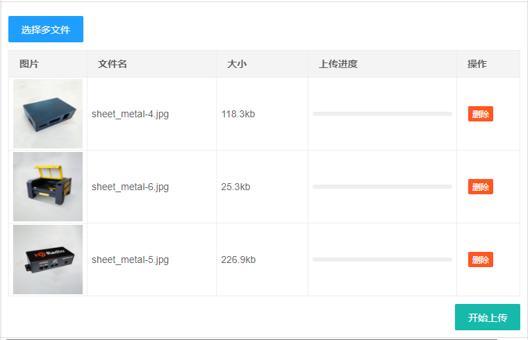 <div class="layui-upload"> <button type="button" class="layui-btn layui-btn-normal" id="ID-upload-demo-files">选择多文件</button> <div class="layui-upload-list"> <table class="layui-table"> <colgroup> <col style="min-width: 100px;"> <col width="100"> <col width="150"> <col width="260"> <col width="100"> </colgroup> <thead> <th>图片</th> <th>文件名</th> <th>大小</th> <th>上传进度</th> <th>操作</th> </thead> @*历史数据*@ <tbody id="ID-upload-pre-files-list"> @{ var filelist = ViewData["UploadedList"] as List<MultiPics>; if (filelist != null && filelist.Count > 0) { foreach (var file in filelist) { <tr id="fileList@((filelist.IndexOf(file)+1).ToString())"> <td> <img src="@file.Content" class="tdPreImg"> </td> <td> <i class="del-img" id="@((filelist.IndexOf(file)+1).ToString())" data-src="@file.FilePath"></i>@file.FileName </td> <td>@file.FileSize KB</td> <td>已上传</td> <td> @*因为layui按钮会提交,此处后台加载的图片,不用layui按钮*@ <input type="button" value="删除" class="btn_del" id="btn_del@((filelist.IndexOf(file)+1).ToString())" data-index="@((filelist.IndexOf(file)+1).ToString())" /> </td> </tr> } } } </tbody> @*当前上传*@ <tbody id="ID-upload-demo-files-list"> </tbody> </table> </div> <button type="button" class="layui-btn" id="ID-upload-demo-files-action">开始上传</button> </div>