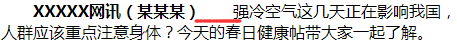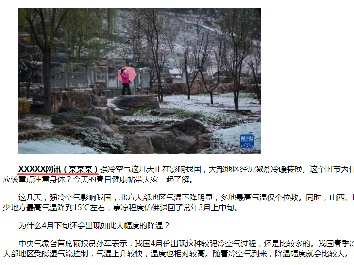 <div class="detail_txt"><p> <span id="detail_header"><b>XXXXX网讯(某某某)</b></span><img src="http://www.n**ew*s.cn/local/2023-04/24/1212170844_16823002967291n.jpg"></p><p> 强冷空气这几天正在影响我国,大部地区经历激烈冷暖转换。这个时节为什么还会出现如此大幅度的降温?气温起伏大容易诱发哪些疾病?哪些人群应该重点注意身体?今天的春日健康帖带大家一起了解。</p><p> 这几天,强冷空气影响我国,北方大部地区气温下降明显,多地最高气温仅个位数。同时,山西、陕西等积雪较深的地区仍有雨雪天气。西南地区东部到长江中下游一带不少地方最高气温降到15℃左右,寒凉程度仿佛退回了常年3月上中旬。</p>